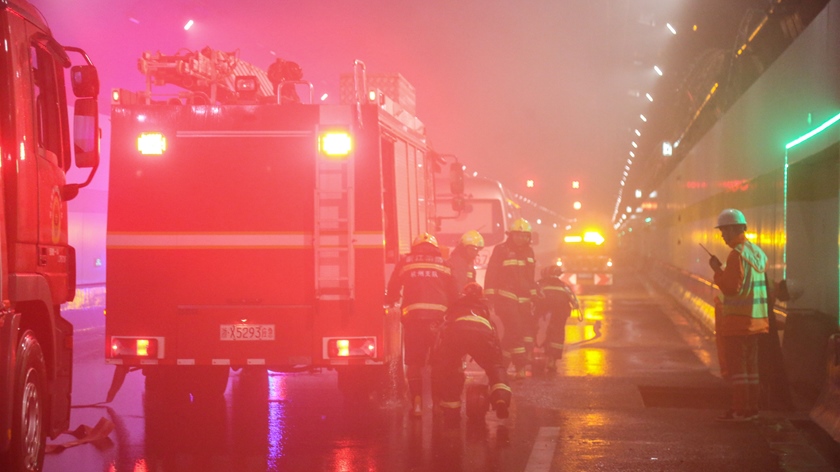 此次演练,市市政设施管理中心从实战出发,先后模拟了隧道发生交通事故的消防处置和防汛应急处置两个场景。在消防处置场景,模拟隧道内发生交通事故,一辆小轿车因变更车道操作不当与另一车道小车发生刮擦碰撞,导致两车相撞起火并伴有浓烟冒出,情况危急。隧道监控中心工作人员第一时间发现事故,更改隧道情报板信号灯、开启广播、开启风机排烟,并协同交警、医护人员共同配合,高效救治伤员。在防汛应急处置场景,模拟黄色暴雨预警情况下,按照市城管局防汛指挥部要求启动防汛三级响应,应急处置人员封闭隧道,清理隧道收水口、使用排水车强排积水,积水消退后清理隧道路面恢复交通。